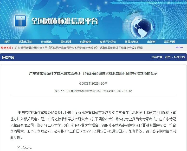 深入贯彻落实《国家标准化发展纲要》,推动广东化妆品行业团体标准建设,构建广东省化妆品行业团体标准体系,引导社会团体制定高质量标准,根据《广东省化妆品科学技术研究会团体标准管理办法》相关规定,由广东诗妃化妆品有限公司、郑州轻工业大学、浙江药科职业大学联合发起立项的《高载液高韧性水凝胶面膜》团体标准,经企业申报、专家审查、公示等环节,现已正式立项。