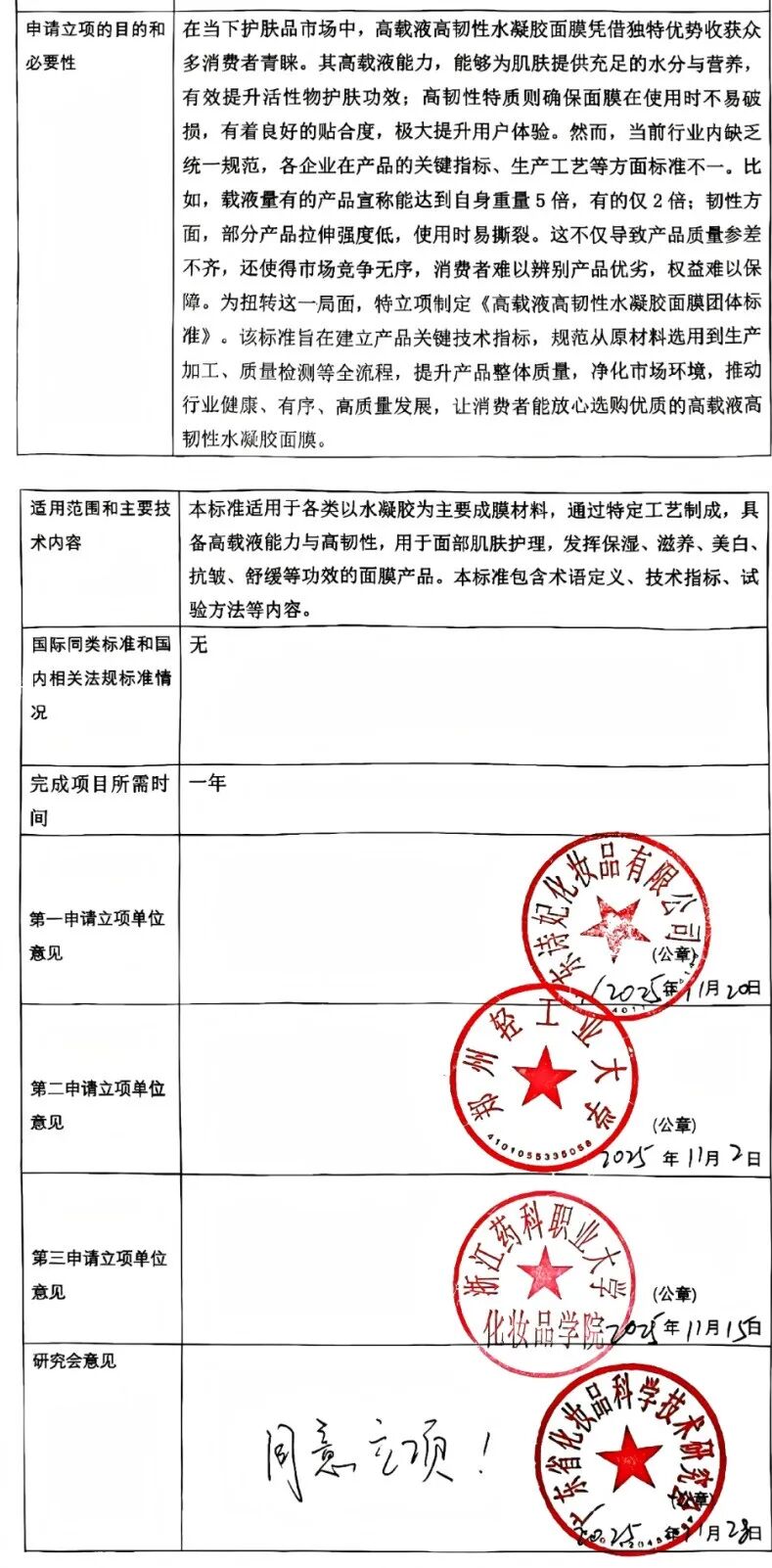 在当下护肤品市场中,高载液高韧性水凝胶面膜凭借独特优势收获众多消费者青睐。其高载液能力,能够为肌肤提供充足的水分与营养,有效提升活性物护肤功效;高韧性特质则确保面膜在使用时不易破损,有着良好的贴合度,极大提升用户体验。然而,当前行业内缺乏统一规范,各企业在产品的关键指标、生产工艺等方面标准不一。比如,载液量有的产品宣称能达到自身重量5倍,有的仅2倍;韧性方面,部分产品拉伸强度低,使用时易撕裂。这不仅导致产品质量参差不齐,还使得市场竞争无序,消费者难以辨别产品优劣,权益难以保障。为扭转这一局面,特立项制定《高载液高韧性水凝胶面膜团体标准》。该标准旨在建立产品关键技术指标,规范从原材料选用到生产加工、质量检测等全流程,提升产品整体质量,净化市场环境,推动行业健康、有序、高质量发展,让消费者能放心选购优质的高载液高韧性水凝胶面膜。