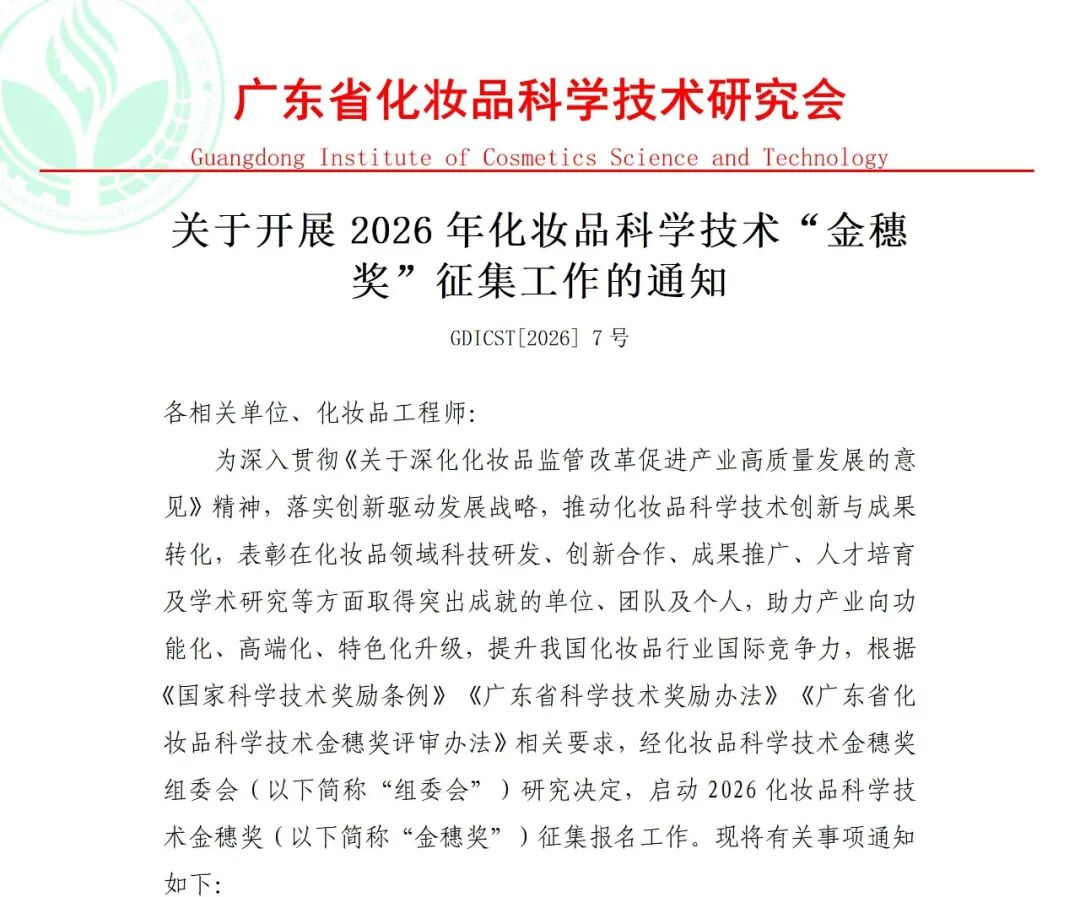 【征集】关于开展2026年化妆品科学技术“金穗奖”征集工作的通知
